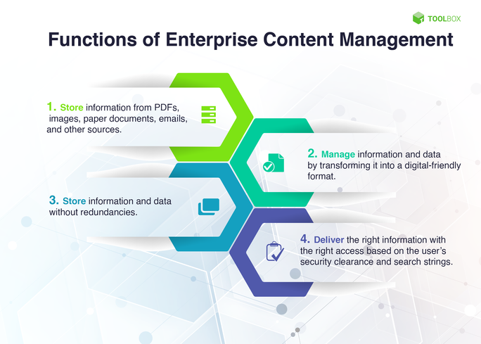 مدیریت محتوای سازمانی (ECM) یک رویکرد جامع برای سازماندهی اطلاعات و دادهها در یک سازمان است. این اطلاعات میتواند شامل:
